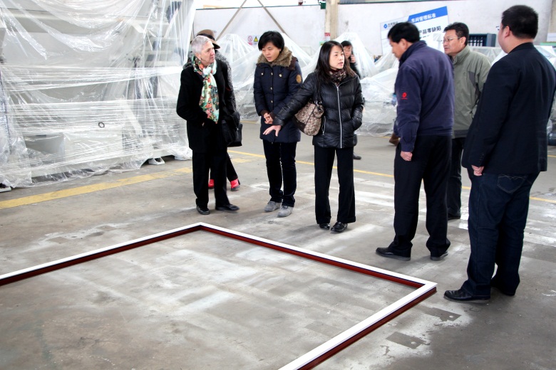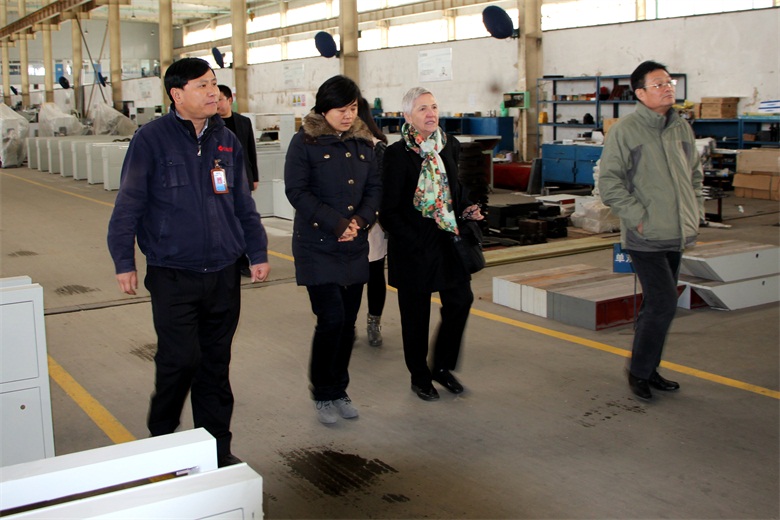 在参观铝机总装车间时,Bernice Herris副校长对我公司目前处于国内领先水平的铝机产品表示了充分肯定,并对其研发、工艺流程进行了详细询问,公司生产副总亓爱林对考察团提出的问题一一作了解答。