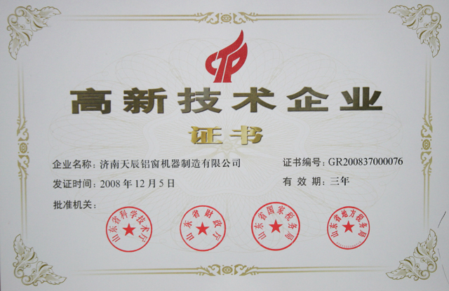 ??? 济南高新区管委会召开了高新区2008年首批高新技术企业授牌大会,并转发了省科技厅、财政厅、省国税局、省地税局的认定的通知,向区内首批高新技术企业颁发了高新技术企业证书和铜牌。天辰铝机公司被认定位山东省2008年第一批高新技术企业。