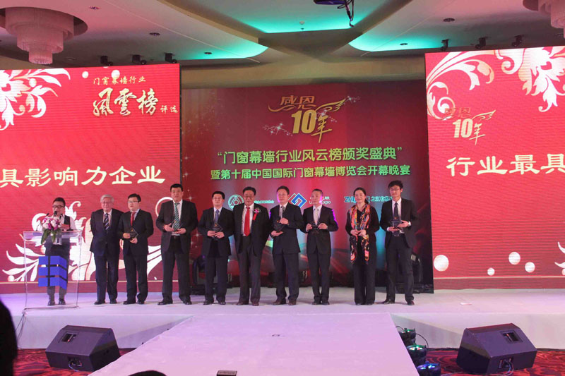 2012年11月23日,由中国建筑金属结构协会主办的“感恩十年——门窗幕墙行业风云榜评选”颁奖盛典在北京举行。经过2个月的激烈角逐,我公司以绝对优势高居加工设备类榜首,荣获一呼百应大奖——最具影响力企业奖。