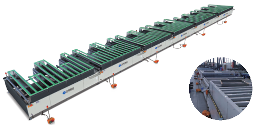 ☆?连接于组角生产线后端,用于组角后窗体的自动传输,并可在本输送线上完成中梃拼装、安装胶条、安装五金、压条配做,直至包装入库的各种工序;